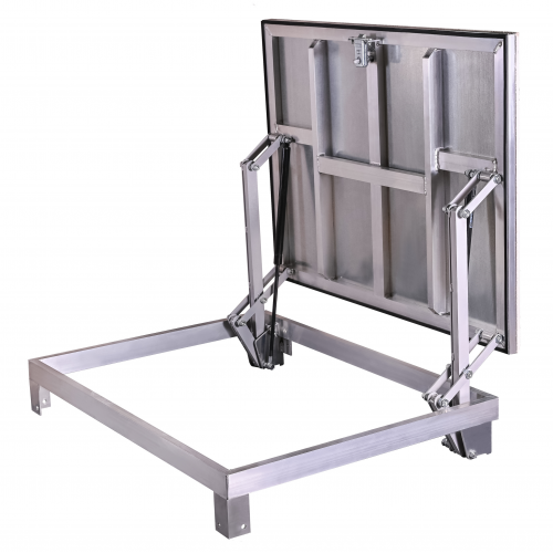 Unikālā grīdas lūkas eņģe paceļ lūkas vāku uz augšu, atverot, nepieskaroties apšuvumam ap lūkas rāmi.